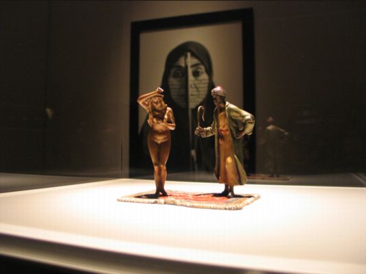 Jüdischer Sklavenhändler führt Frau als Angebot vor. - Im Hintergrund eine muslimische Frau mit einem Gewehr in der Hand. Stichwort: Alle Muslime sind (typisch!?) Gewalt bereit.